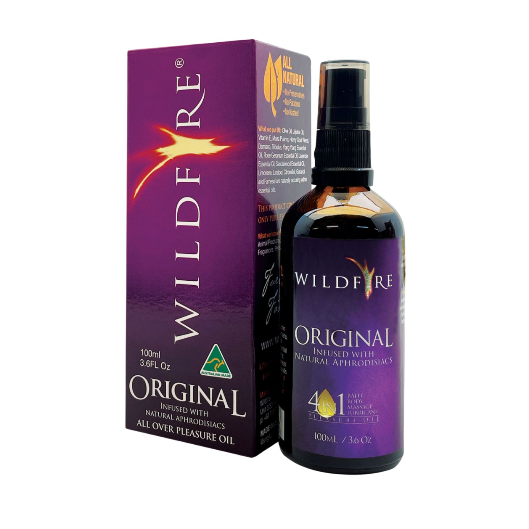 Take in the aroma, warmth, and new sensations of this all-natural aromatherapy massage oil. Whether your desire is a relaxing massage, sumptuous bath, or soft supple skin this oil is perfect.Wildfire® ORIGINAL is also infused with herbal aphrodisiacs to truly enhance your intimate moments in the bedroom. Put simply, it’s the perfect body oil to help you discover each other all over again.